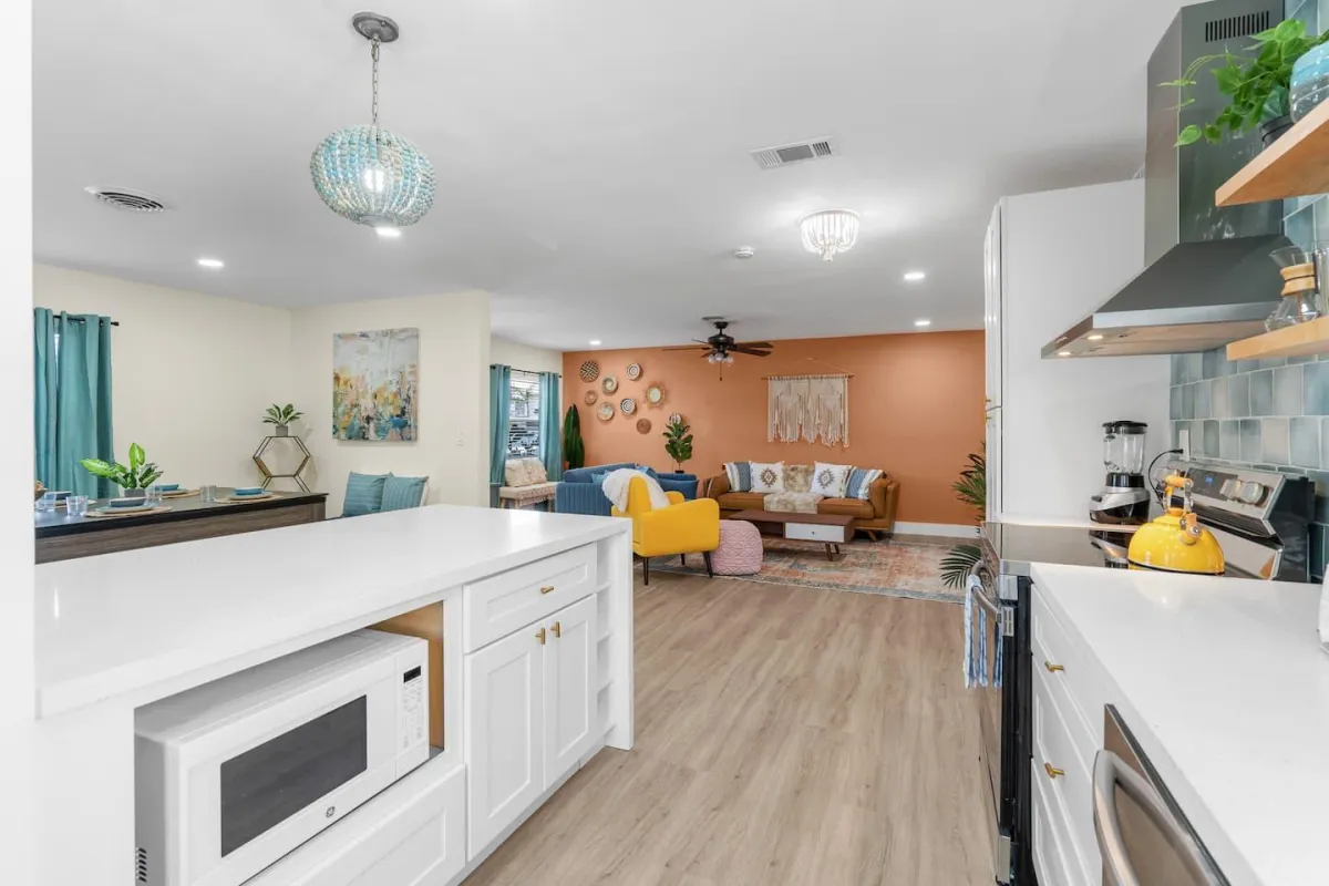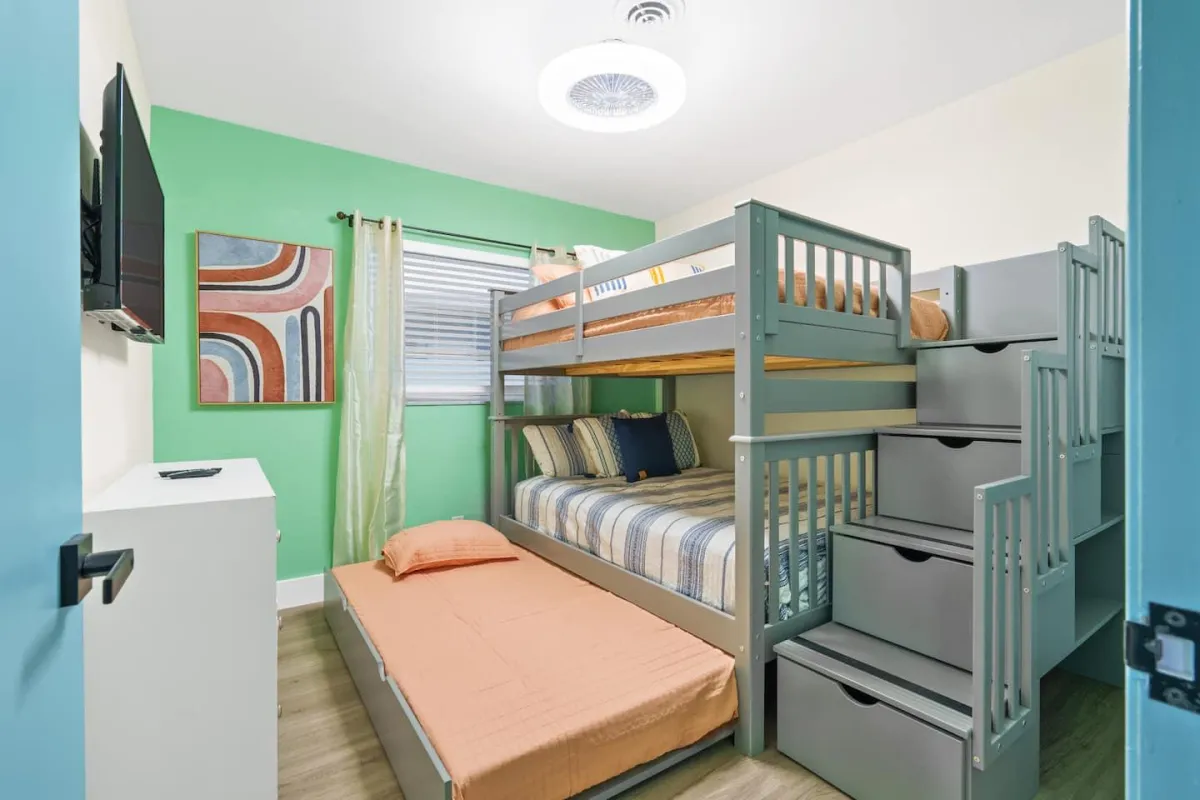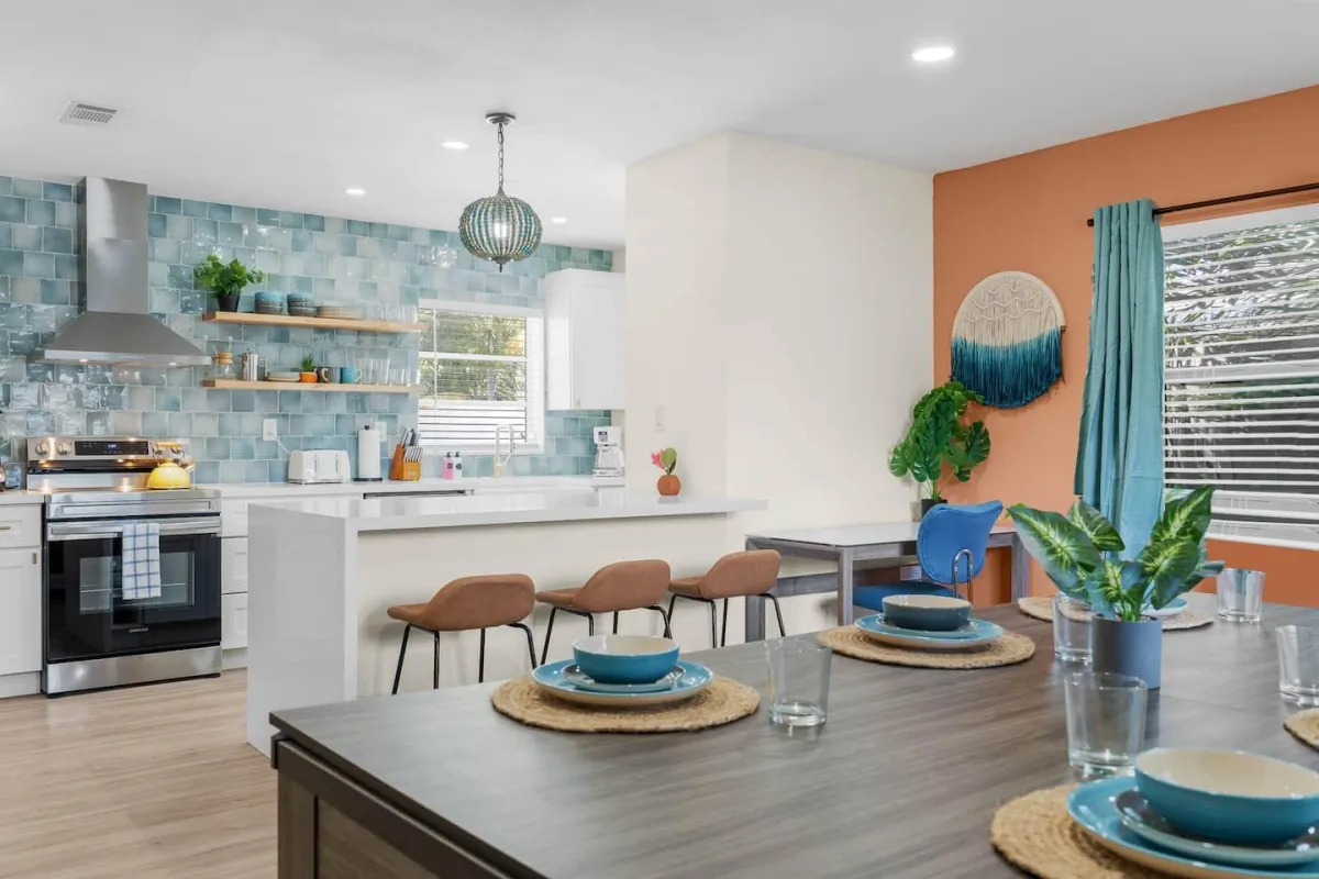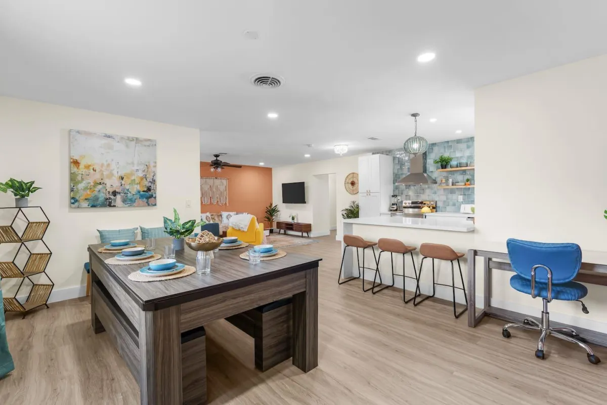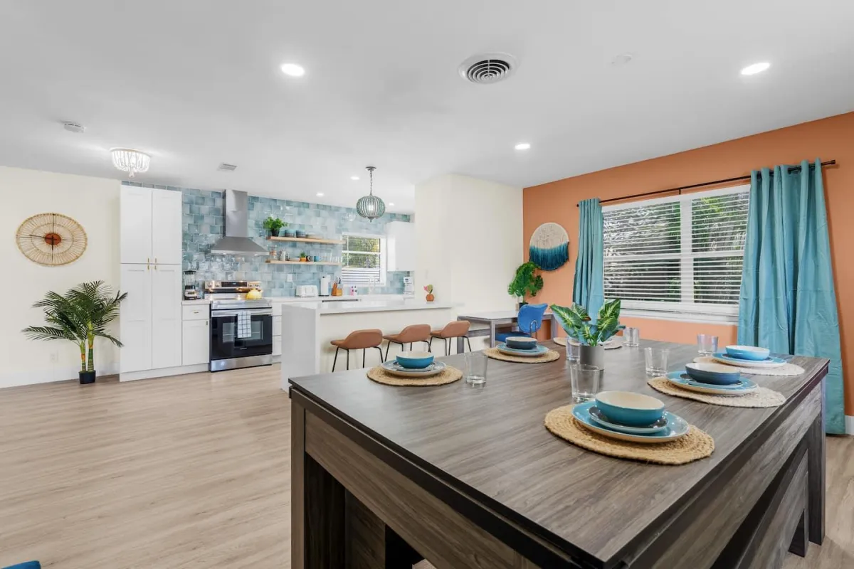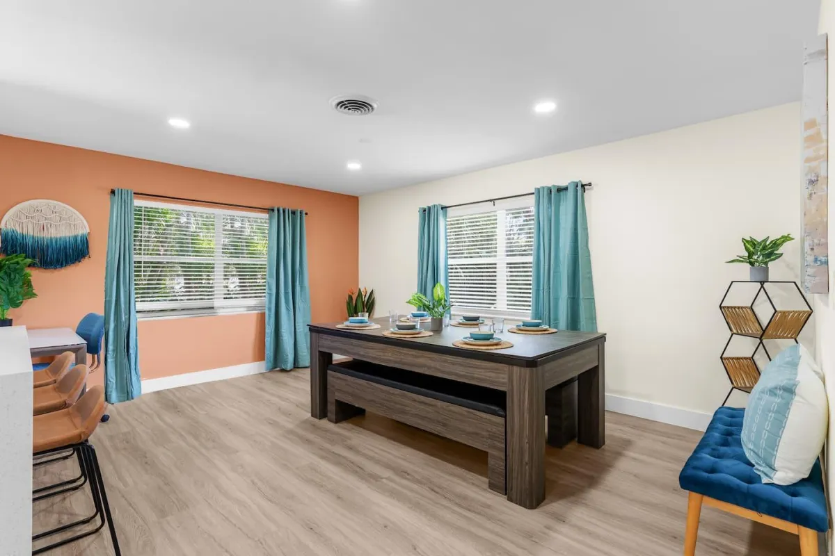 This beautiful home is perfect for families or groups of up to 7 guests. It has 3 cozy bedrooms, 2 full bathrooms & is just a short walk from the beach. The open-concept living area has a fully equipped kitchen & a large dining room table that converts into a pool & ping pong table.